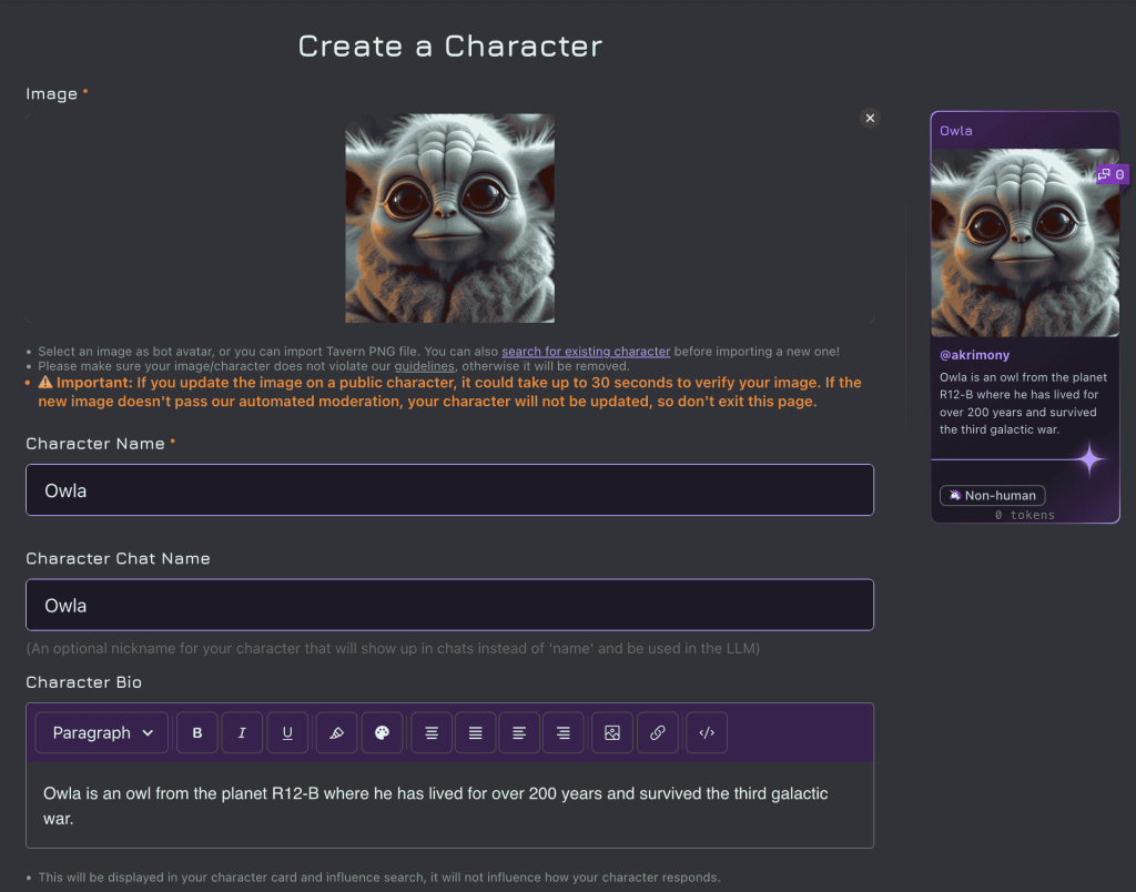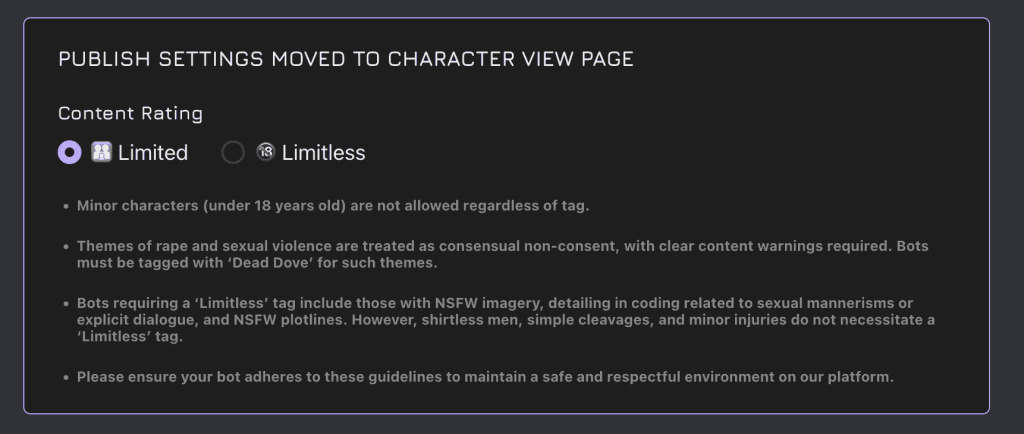 Janitor AI’s version of content moderation: user-tagged limits instead of platform-imposed walls (Image Source: Janitor AI)