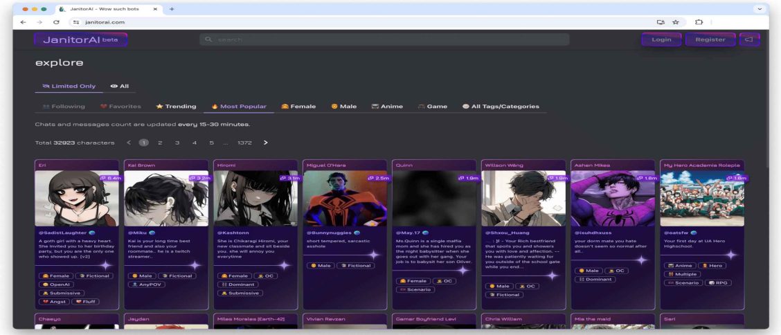 Screenshot of Janitor AI’s character gallery, the digital doorway into user-created intimacy (Image Source: Janitor AI)